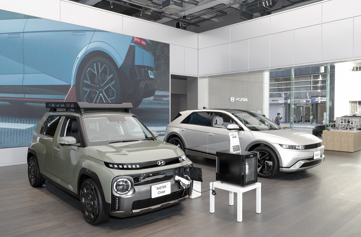 오사카 CXC 1층은 전시·정비·납차 공간으로 활용된다. 중앙 공간에는 인스터(캐스퍼 일렉트릭)의 확장형 모델 인스터 크로스와 아이오닉 5가 나란히 전시돼 있었다.