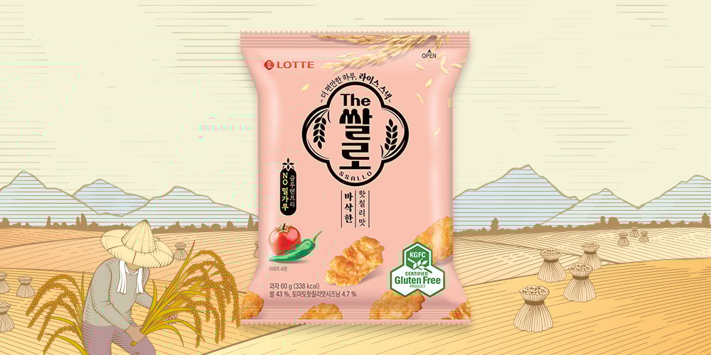 '쌀로(SSALO)' 브랜드는 '쌀로 만든 간식'이라는 의미의 미과(米菓) 통합 브랜드다. 패키지에는 '건강한 쌀로 만든'이라는 문구와 함께 벼 이삭 일러스트, 흰색 배경을 적용해 브랜드 메시지를 직관적으로 전달했다. 기존의 자극적인 스낵 이미지에서 벗어나, '가볍고 깨끗한 간식'의 정체성을 시각적으로 표현한 것이다.