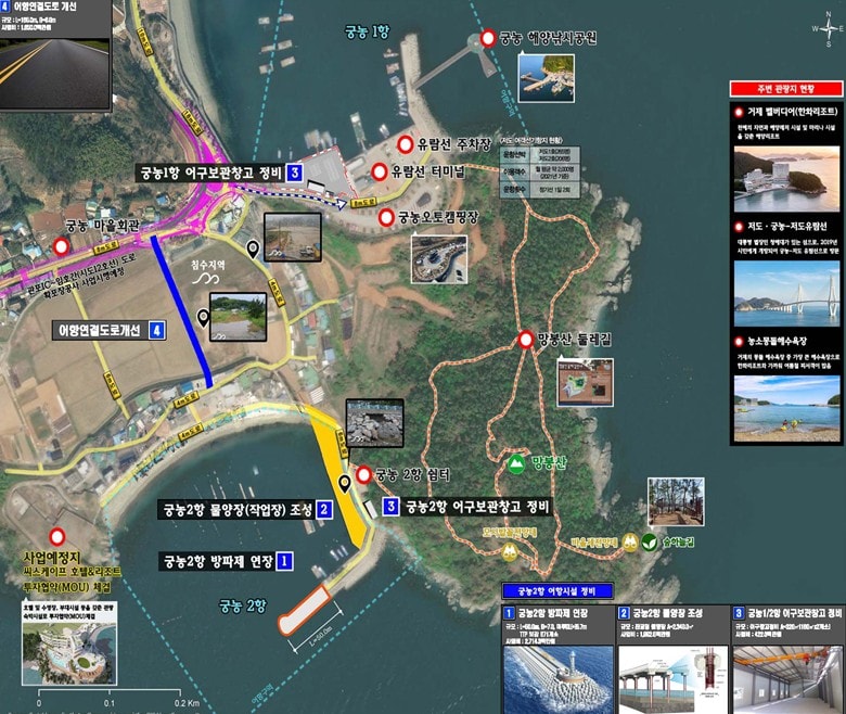궁농항은 저도 유람선, 어선, 레저선이 혼재해 안전사고와 민원이 잦았던 지역으로, 이번 사업을 통해 외곽 방파제 확장과 정온수역 확보, 어항 기능 분리, 해양레저 강화 등 안전성과 관광 기능을 동시에 높일 계획이다.