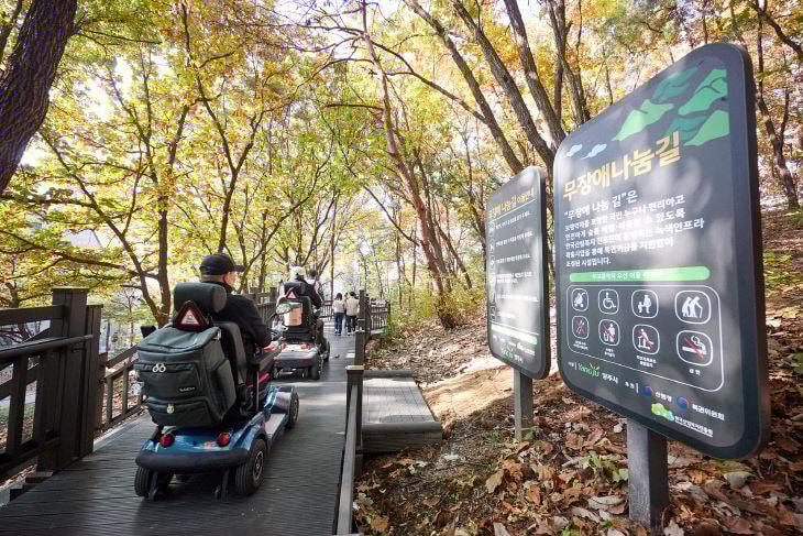 6일 시에 따르면 무장애길은 장애인·노인·임산부·어린이 등 보행약자도 불편함 없이 이동할 수 있도록 경사와 턱을 최소화하고, 보행 폭과 노면을 평탄하게 설계한 길이다. 단순한 산책로를 넘어 세대와 세대를 잇고, 모두가 함께 자연을 누릴 수 있는 포용의 길로 자리 잡고 있다.