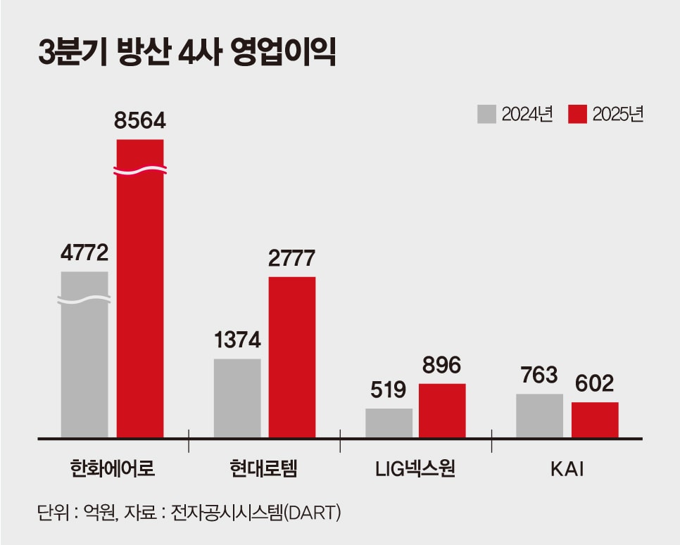 6일 전자공시시스템(DART)에 따르면 한화에어로스페이스, 현대로템, LIG넥스원, 한국항공우주산업(KAI)의 3분기 합산 영업이익은 1조2839억원이다. 지난해 같은 기간(7428억원) 대비 72.8% 늘었다.