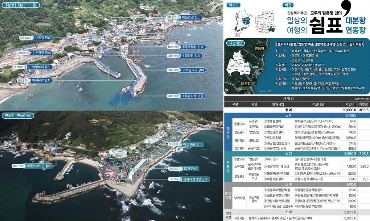 주요 사업은 △대본항 방파제·물양장·선양장 정비 △도로 및 안전관리시설 개선 △공동작업장 신축 △연동항 관광체험거점 조성 △빈집정비 △마을경관개선 등이며, 총사업비는 103억원으로, 이 중 국비 70억 원, 지방비 30억 원, 자부담 3억원이 투입된다. 사업은 2026년부터 2029년까지 4년간 추진된다.