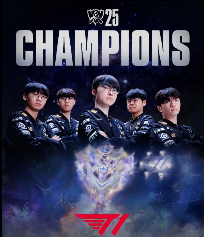 T1은 지난 9일(한국시각) 중국 청두 동안호 스포츠 파크 다목적 체육관에서 열린 2025 리그 오브 레전드(LoL) 롤드컵 결승전에서 KT를 세트스코어 3-2로 꺾고 우승을 차지했다.