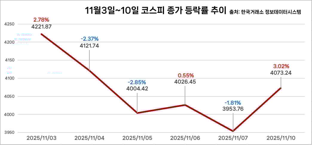 11일 한국거래소에 따르면 지난 3일부터 10일까지 코스피는 급등과 급락을 반복했다. 3일 종가 기준 4221.87을 기록한 코스피는 7일에는 3953.76까지 떨어진 뒤 10일엔 4000선을 회복하며 4073.24로 마감했다. 6거래일간 코스피의 전체 등락률은 –3.52%를 기록했는데 특히 일간 등락 폭이 컸다.