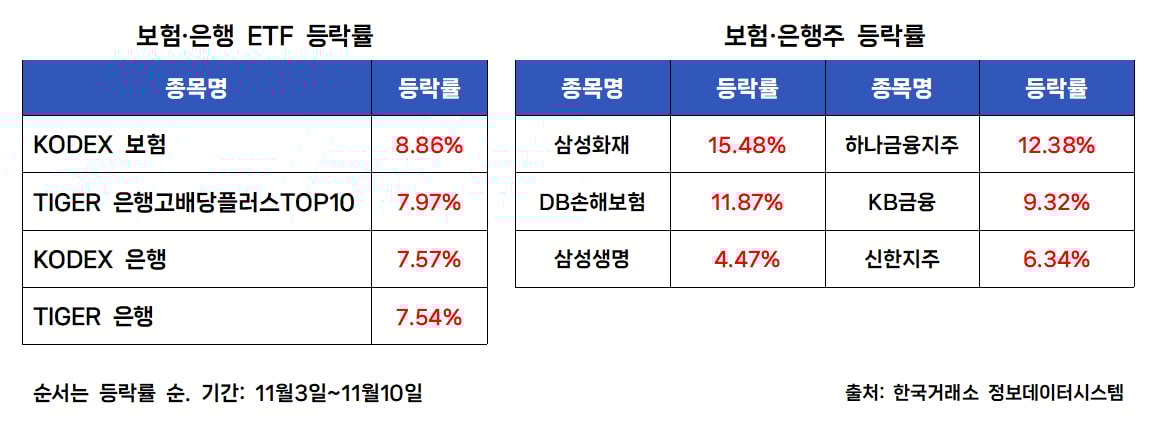 이는 ETF가 추종하는 종목들의 추세에서도 확인된다. 삼성화재 주가는 3일 44만2500원이었으나 10일에는 51만1000원을 기록해 15.48% 상승했다. 같은 기간 DB보험 11.87%, 삼성생명은 4.47% 올랐다. 은행 관련주도 힘을 받았다. 하나금융지주가 12.38% 상승한 것을 비롯해 ▲KB금융 9.32% ▲신한지주는 6.34% ▲우리금융지주는 2.75% 올랐다.