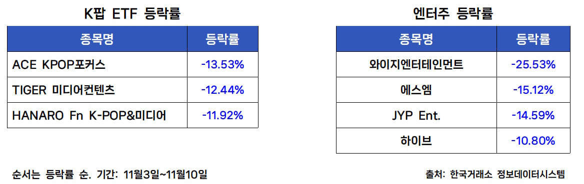 반면 KPOP 관련 엔터주의 하락폭은 컸다. ACE KPOP포커스는 13.53% 하락률을 보였다. TIGER 미디어컨텐츠 12.44%, HANARO Fn K-POP&미디어도 11.92% 하락했다.