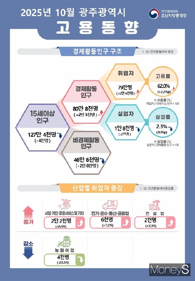 12일 국가데이터처 호남통계청이 발표한 '10월 광주전남 고용동향'에 따르면 광주지역의 15세 이상 취업자 수는 79만명으로 지난해 같은 달보다 2만6000명(3.4%)이 증가했다. 고용률은 62.0%로 2.2%포인트 상승했다.