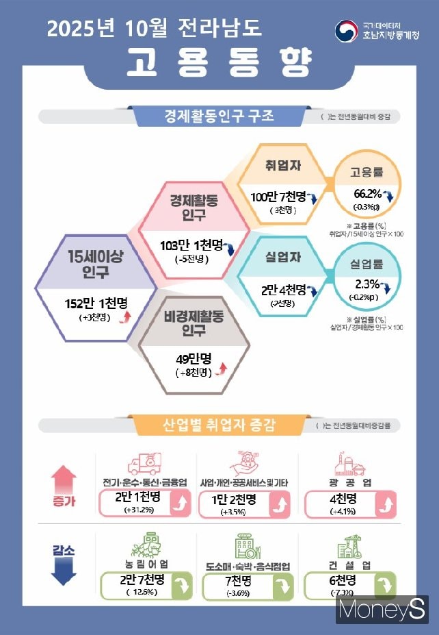 전남 15세 이상 취업자는 100만7000명으로 지난해 같은 달보다 3000명(0.3%)이 감소했다. 고용률은 66.2%로 0.3%포인트 하락했다.