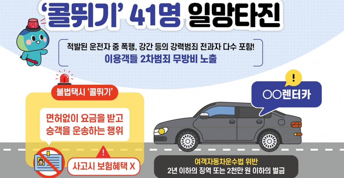 일명 '콜뛰기'로 불리는 불법 유상 운송은 여객자동차운송사업 면허 없이 요금을 받고 승객을 운송하는 행위다. 차량 안전 점검이나 보험 가입, 운전자 자격 검증이 이뤄지지 않아 심각한 위험을 초래할 수 있다.