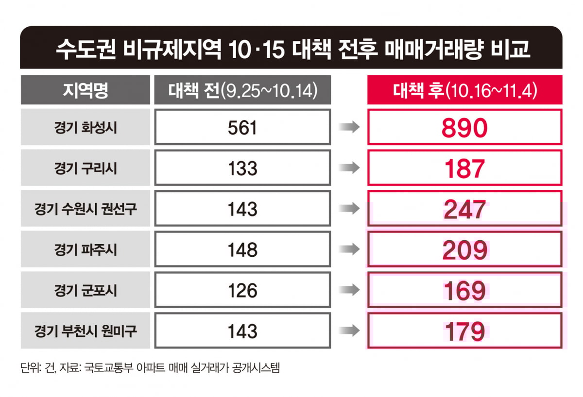 지난 10일 부동산플랫폼 직방이 국토부 실거래가를 분석한 자료에 따르면 10·15 부동산대책 발표 후인 10월 16일부터 11월 4일까지 비규제지역의 아파트 거래량은 5170건에서 6292건으로 22% 증가했다. 같은 기간 규제지역은 아파트 거래량이 1만242건에서 2424건으로 76% 감소했다.