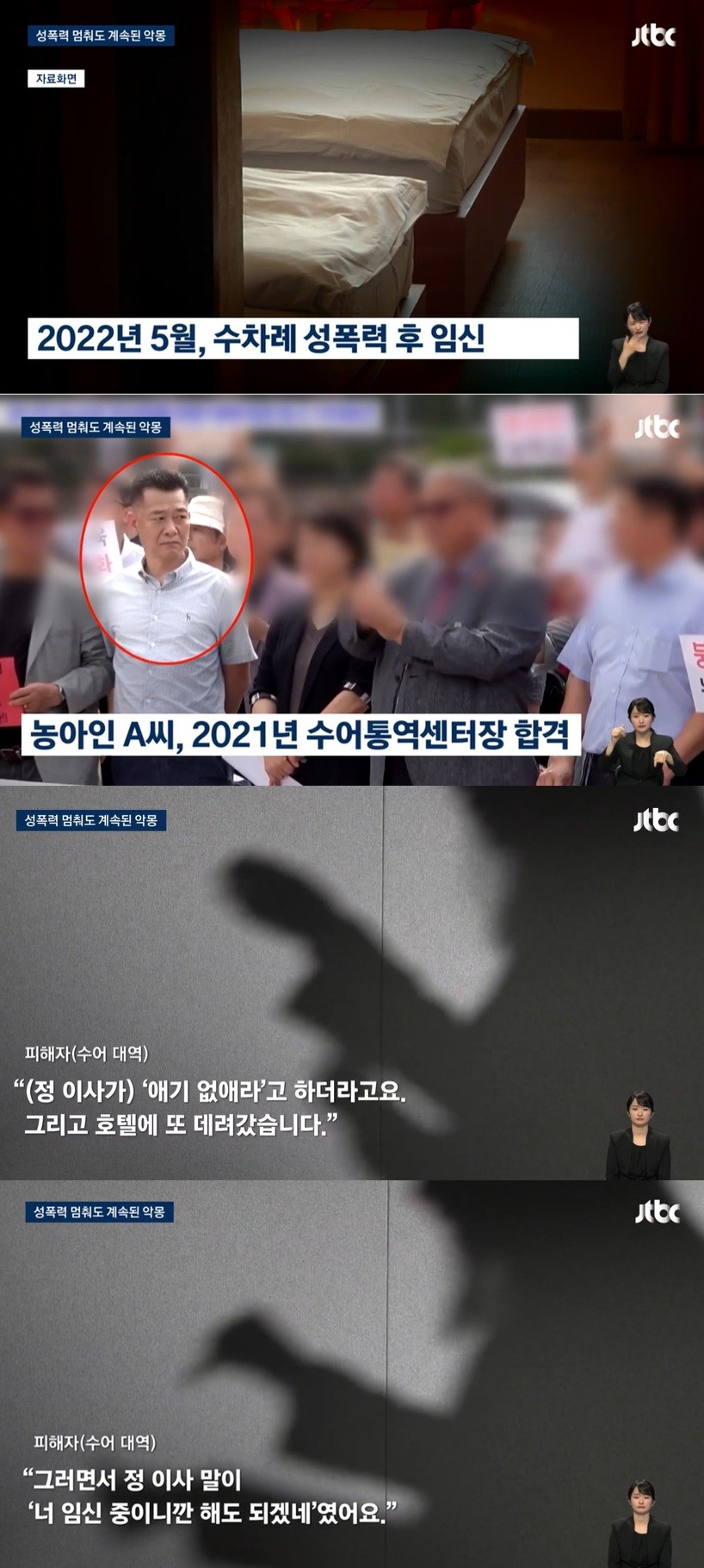 같은 해 5월 A씨는 여러 차례 성폭력을 당해 결국 임신까지 하자 "임신 중이니까 괜찮겠네"라며 또다시 성폭력을 저질렀다. 이후 정 이사는' 낙태 수술을 하라'며 돈 50만원 정도를 건넸다고도 말했다. A씨는 또 다른 협회 간부에게도 성희롱당했다. 2023년 2월 조모 전 사무총장은 A씨에게 수어로 "언제 데이트 갈래"라고 물었다. A씨가 대답을 피하자 조 전 사무총장은 "나중에 너 쫓아내면 어떻게 할 건데", "모든 것을 다 듣고 알고 있다"고 했다.
