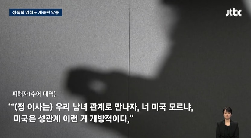 2021년 수어 통역센터장을 맡게된 A씨에게 정 모 이사(50대)는 "밥 먹으러 가자", "만나서 놀자"고 접근했고, A씨는 그때마다 "싫습니다"라고 거절했다. 하지만 정 이사의 표현은 점점 노골적으로 변했다. A씨에게 남녀 관계로 만나자고 했으며 "미국 모르냐", "미국은 성관계 이런 것에 개방적이다. 서로 즐기면 되지"라고 강요하듯 말했다.