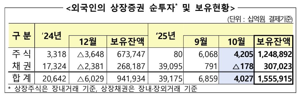 14일 금융감독원에 따르면 10월 중 외국인이 상장주식 4조2050억원을 순매수하고, 상장채권 1780억원을 순회수해 총 4조270억원을 순투자했다.