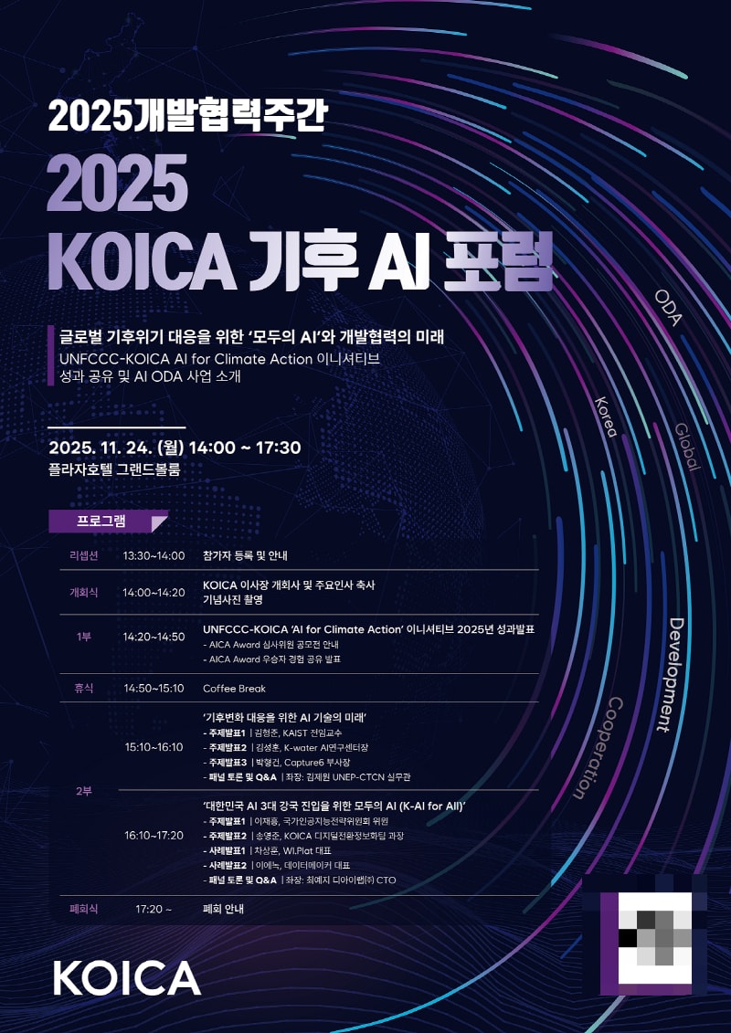 코이카(KOICA·한국국제협력단)가 오는 24일 오후 서울 플라자호텔 그랜드 볼룸에서 '2025 코이카 기후 AI 포럼'을 개최한다. 오는 24~29일 진행되는 '2025 개발협력주간'의 첫 공식 행사이기도 하다.
