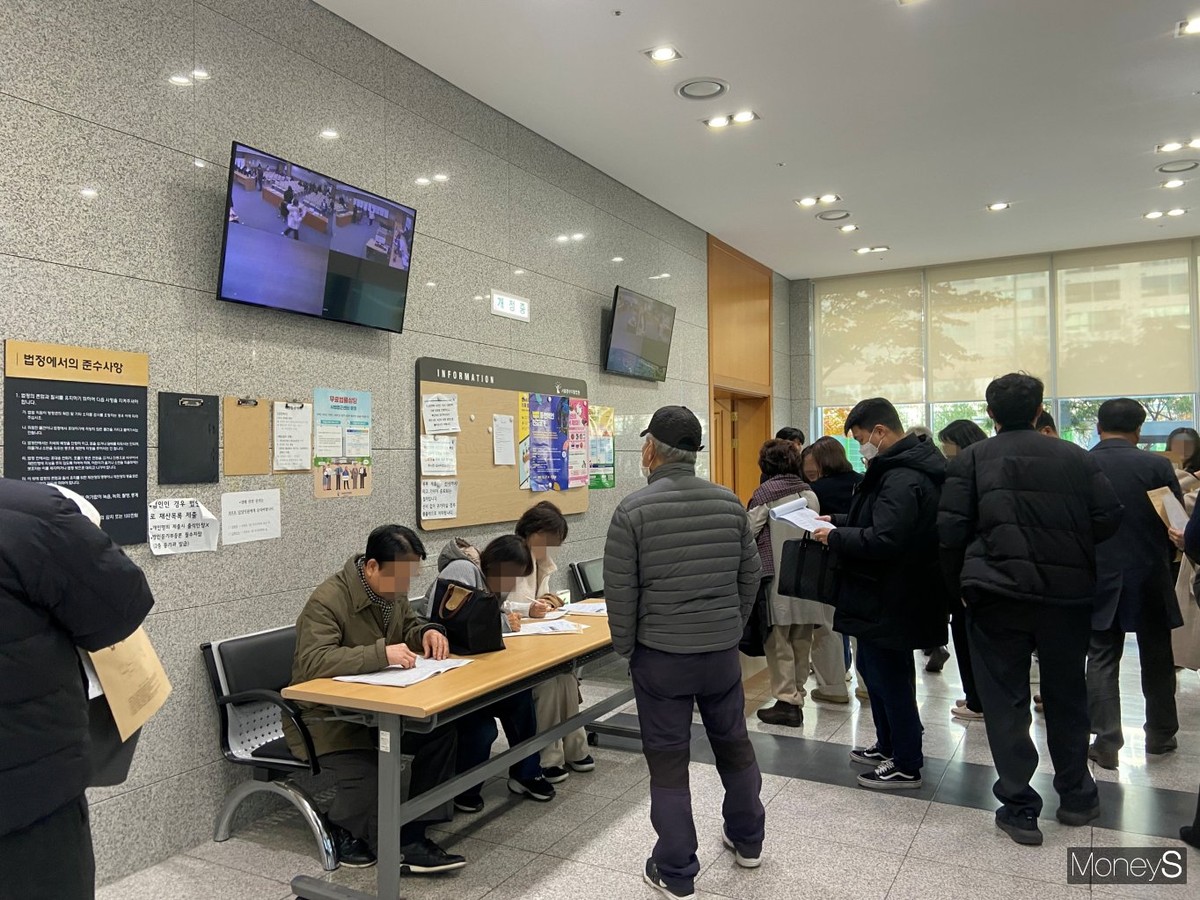 17일 오전 서울동부지방법원 법정동 101호. 기재대로 가기 전 입찰 가격을 상의하는 30대 신혼부부부터, 벽에 붙은 매각기일부를 여러 번 넘겨보는 70대까지, 법정 앞은 인산인해를 이뤘다. 현장에서 대출 광고문과 명함을 나눠주던 A씨는 "정부가 대출과 갭투자(전세권을 포함한 매수계약) 규제를 강화하면서 실거주 의무가 없는 경매 경쟁률이 더욱 높아졌다"고 설명했다.