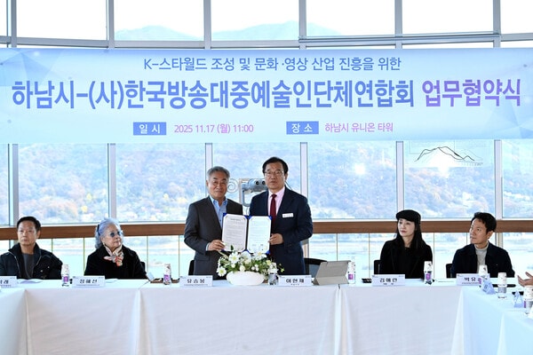 시는 지난 17일 하남시 유니온타워에서 한국방송대중예술인단체연합회와 'K컬처 복합 콤플렉스(K스타월드)'의 성공적 추진과 대한민국 문화영상산업의 경쟁력 강화를 위한 업무협약을 체결했다고 18일 밝혔다.