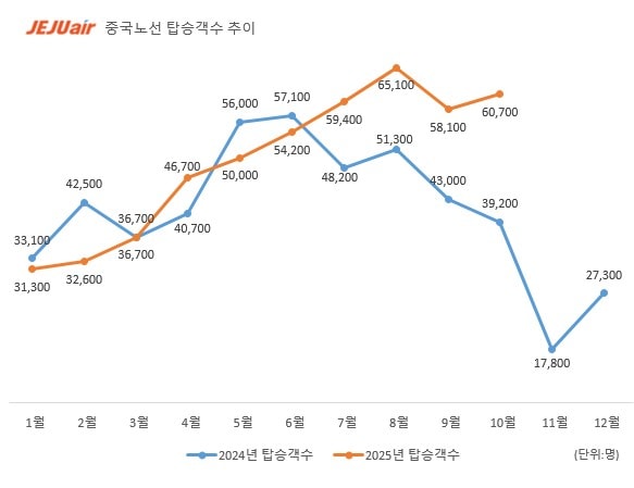 제주항공의 올해 1~10월 중국노선 탑승객은 49만5000여명으로 2024년 중국노선 탑승객 49만2900여명에 비해 2000명 이상 많다. 지난해 같은 기간(1~10월) 44만7800여 명과 비교해서는 10% 이상 증가했다.