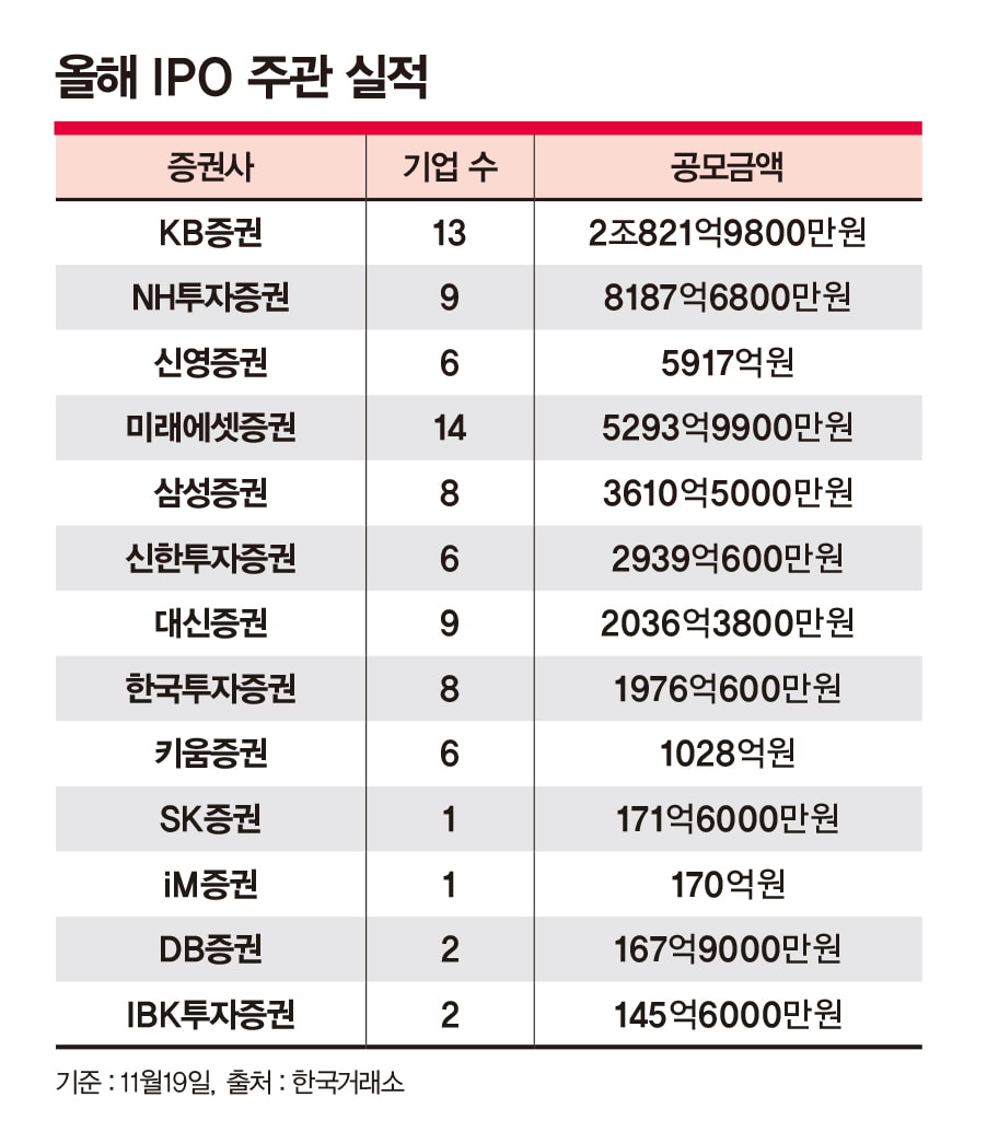 KB증권이 금액 기준 압도적으로 1위를 차지한 것은 올해 최대어로 여겨졌던 LG씨엔에스, 대한조선, 명인제약의 IPO를 잇달아 주관하는 성과를 냈기 때문이다. LG씨엔에스 대표 주관을 통해 KB증권은 총 1조1994억4800만원에 달하는 공모 실적을 달성했다. 대한조선과 명인제약 역시 대표 주관사로 각각 5000억원, 1972억원의 공모실적을 올렸다.