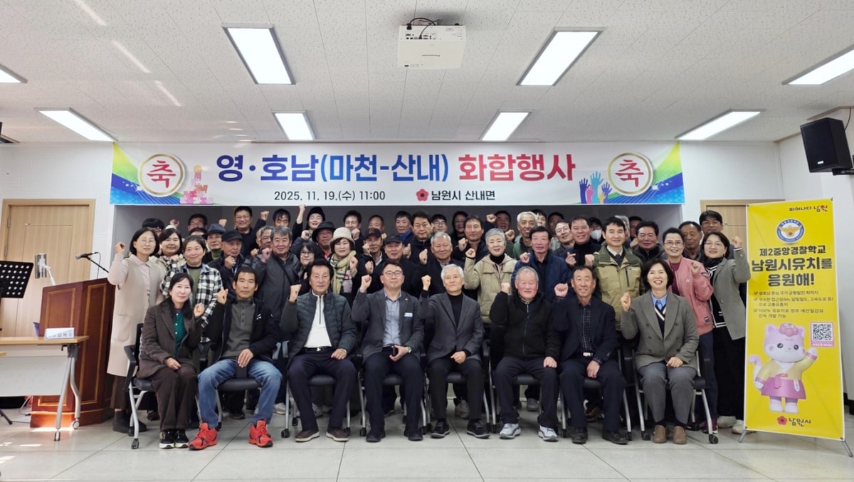 함양군 마천면과 자매결연지인 남원시 산내면이 지난 19일 산내면 행정복지센터에서 '2025 영·호남 화합행사'를 열고 두 지역 간 우의를 재확인했다.