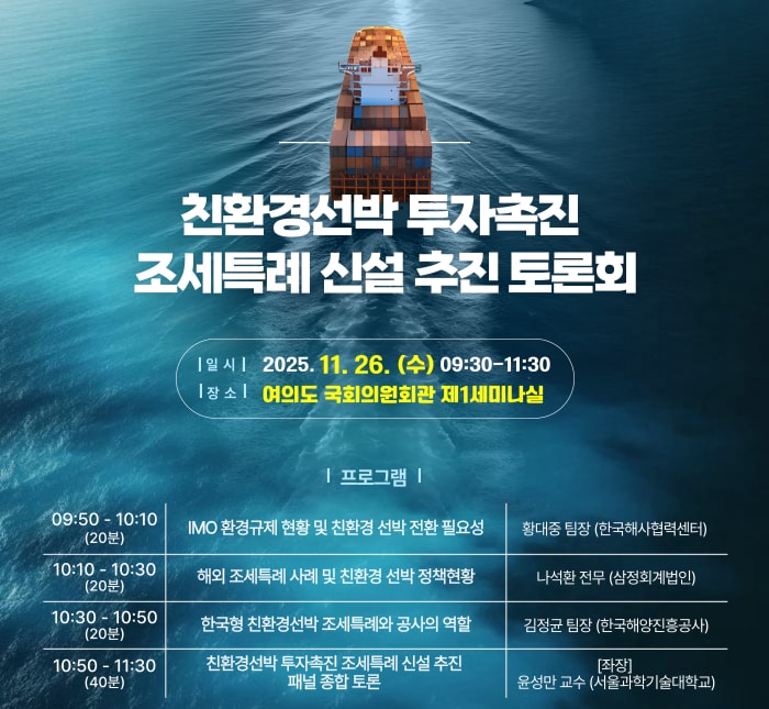 해진공은 제도화 논의를 본격화하기 위해 오는 26일 서울 여의도 국회의원회관에서 '친환경 선박 투자 촉진 조세특례 신설 추진 토론회'를 개최해 해운 분야 관계자들의 의견을 수렴할 예정이다.