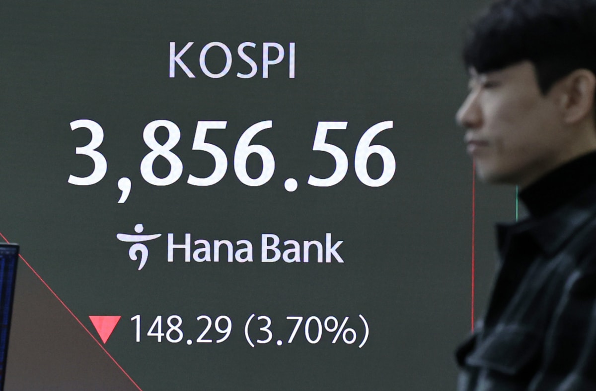 21일 한국거래소에 따르면 오후 1시27분 기준 코스피는 전 거래일 대비 160.30포인트(4.00%) 하락한 3844.55에 거래되고 있다. 개인과 기관은 각각 1조9857억원, 2393억원을 순매수 중이다. 외국인은 2조2595억원을 순매도 중이다.