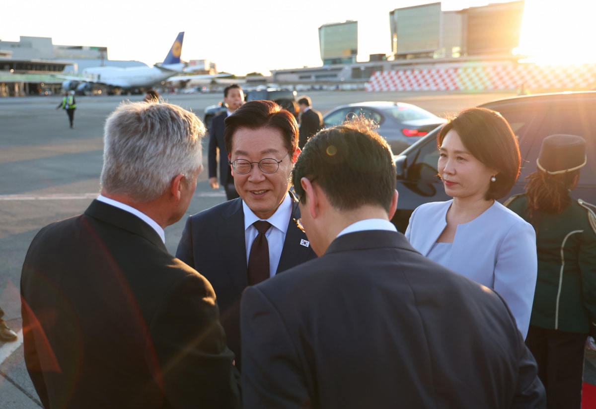 이재명 대통령이 지난 23일(현지시각) 남아프리카공화국에서 열린 주요 20개국(G20) 정상회의 참석을 마치고 튀르키예로 출국했다. 사진은 G20 정상회의 일정을 마친 이재명 대통령이 이날 남아프리카공화국 요하네스버그 국제공항에서 튀르키예 앙카라로 출발하기 전 양동한 주남아공 대사와 악수를 나누는 모습. /사진=뉴시스