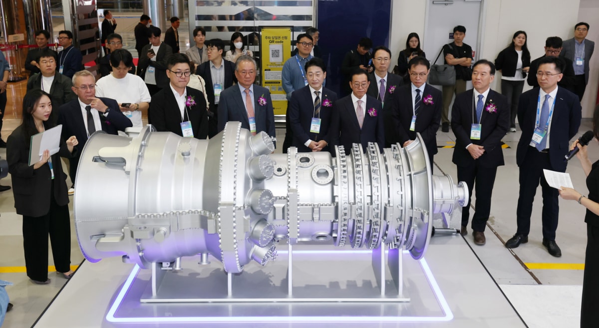 KB증권이 두산에너빌리티에 대해 대형원전을 중심으로 중단기 성장 기반이 구축될 것이라고 24일 전망했다. 사진은 10월15일 서울 코엑스에서 열린 '스마트에너지플러스 2025' 개막식에 전시된 두산에너빌리티의 수소터빈 모형. /사진=머니투데이