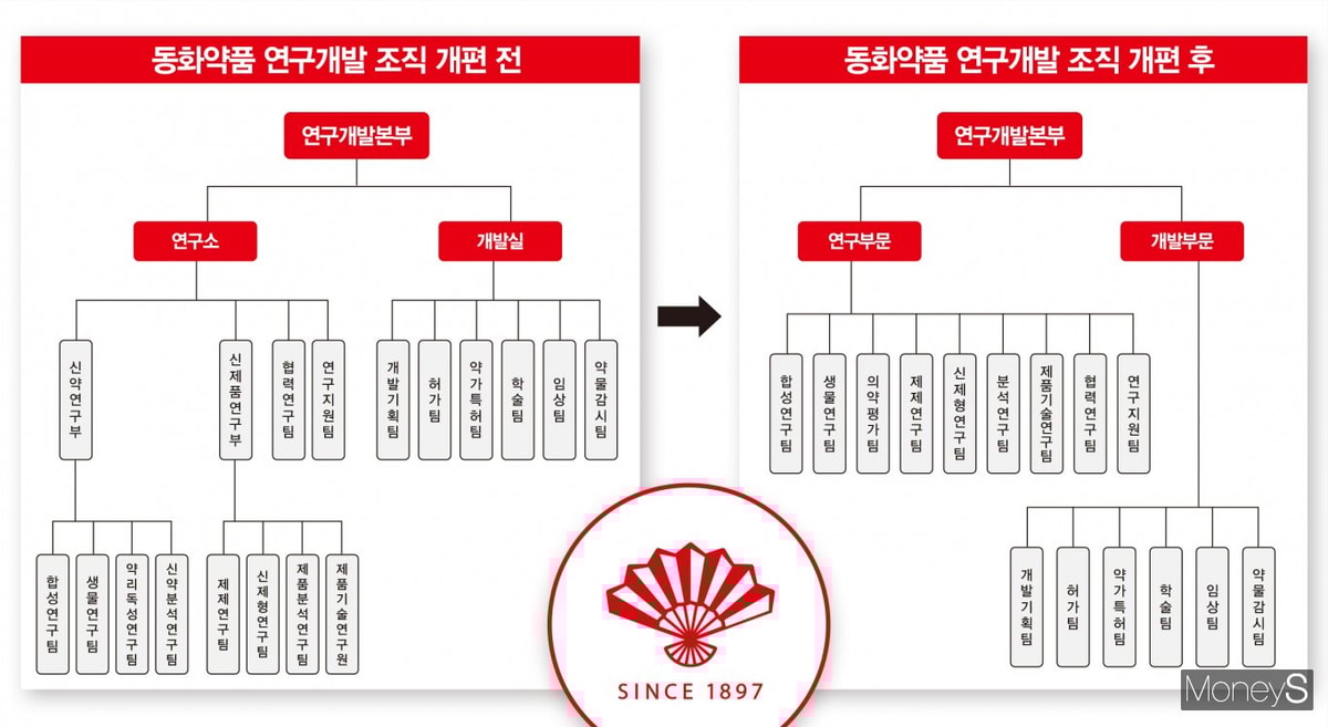 이번 조직 개편은 부 체제 단순화에 방점이 찍혔다. 이를 통해 구성원들의 의사소통이 원활해지면서 업무 효율 또한 높아질 것으로 기대된다. 동화약품은 R&D 조직 개편을 계기로 제약사의 본분인 신약개발 속도를 높여갈 방침이다.