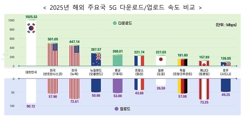한국통신사업자연합회(KTOA)는 24일 미국, 프랑스, 일본, 독일, 캐나다, 호주, 뉴질랜드 등 해외 7개국을 대상으로 한 이동통신 서비스 품질 조사 결과를 발표했다. 조사에 따르면 SK텔레콤·KT·LG유플러스 등 국내 통신 3사의 2024년 5G 평균 다운로드 속도는 1025.52Mbps로 7개국 평균인 268.01Mbps보다 3.8배 이상 높았다. 조사 대상국 중 가장 빠른 미국 샌프란시스코 속도 501.05Mbps와 비교해도 2배 이상 속도다.