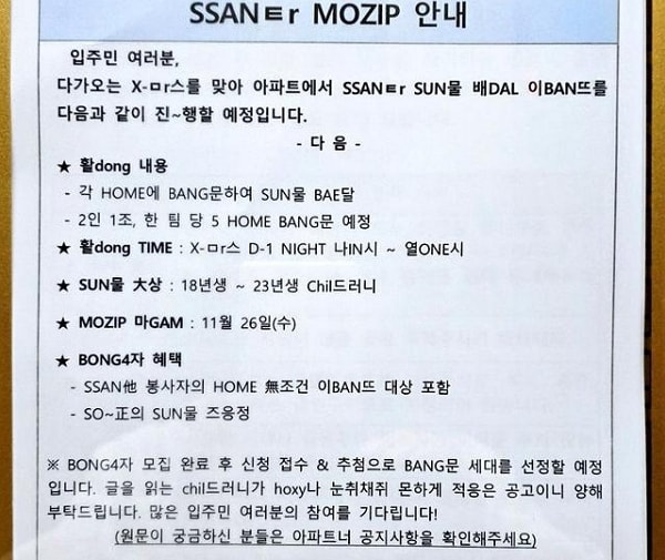 또 'MOZIP 마GAM(모집 마감): 11월 26일' 'BONG4(봉사)자 혜택: ▲SSAN他(싼타) 봉사자의 HOME 無조건 이BAN뜨(무조건 이벤트) 대상 포함 ▲SO~正(소정)의 SUN물(선물) 즈응정'이라고 적혀 있다. 모집 마감일은 오는 26일이며 봉사자는 이벤트 대상에 무조건 포함되고 소정의 선물도 증정받을 수 있다는 내용이다.