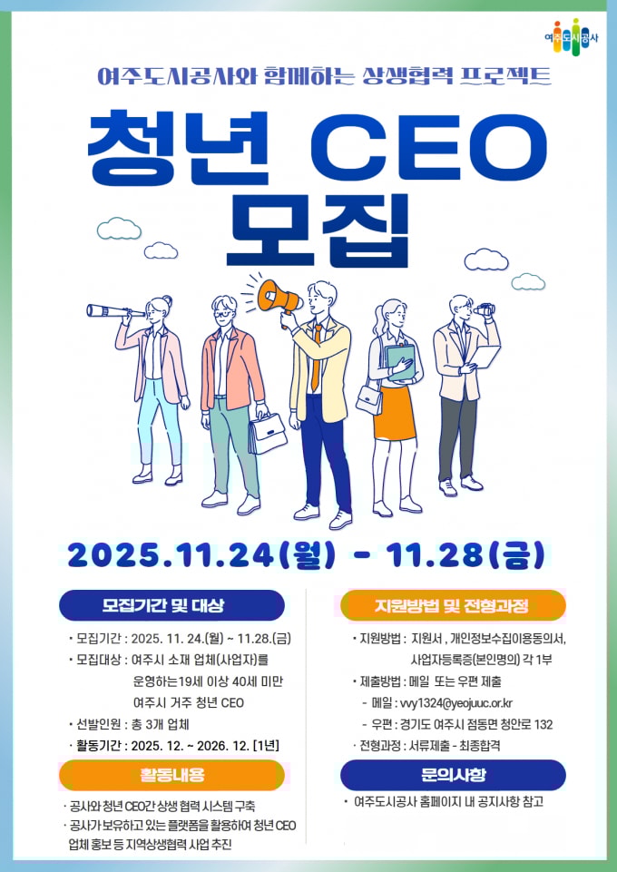 여주도시공사(이하 '공사')는 지역 청년 사업가의 성장을 지원하고 공사와 민간의 상생협력 기발을 구축하기 위해 오는 24일부터 28일까지 '청년 CEO'를 모집한다고 25일 밝혔다.