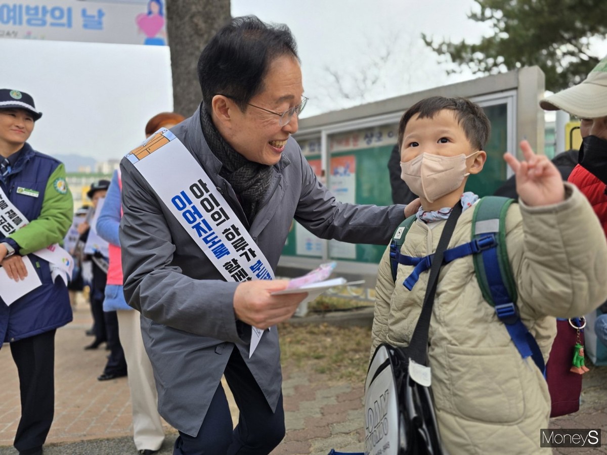 임종식 경북도교육감이 25일 구미상모초등학교에서 열린 아동학대 예방 캠페인 현장에서 등굣길 학생과 대화하며 학생의 순수한 행동에 환하게 웃고 있다. /사진=머니S 박영우 기자