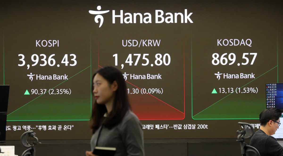 코스피가 전 거래일(3846.06)보다 96.30포인트(2.50%) 상승한 3942.36에 개장한 24일 오전 서울 중구 하나은행 딜링룸 전광판에 지수가 표시 되고 있다. 코스닥 지수는 전 거래일(856.44)보다 11.40포인트(1.33%) 오른 867.84에 거래를 시작했다./사진=뉴시스