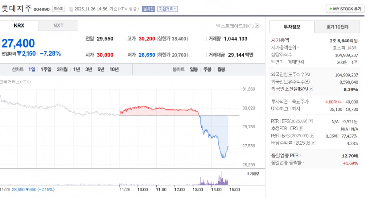 한국거래소에 따르면 롯데지주는 오후 2시56분 기준 전 거래일 대비 7.28% 급락한 2만7400원에 거래 중이다. 롯데지주 주가는 오전에는 상승세를 보였지만 오후 들어 떨어져 발표 직후 10% 넘게 빠지기도 했으나 천천히 낙폭을 줄이는 중이다.