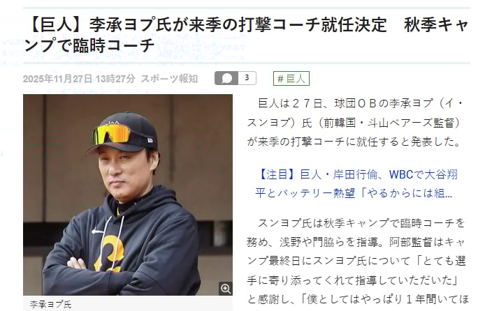 일본 스포츠호치와 닛칸스포츠 등 현지 매체는 27일 "요미우리가 이승엽 전 감독에게 1군 타격 코치를 맡겼다"고 보도했다. 가을 캠프에 임시 타격코치로 갔던 이승엽 전 감독은 선수 시절 절친 아베 신노스케 요미우리 감독의 러브콜을 받고 고심한 끝에 정식 코치직을 수락했다.