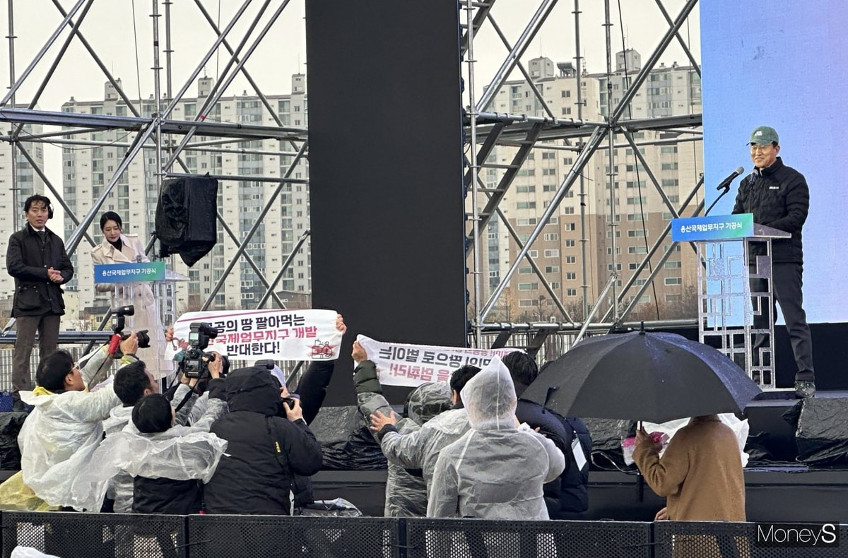 이날 기공식 현장에서 주거·빈곤·노동·시민사회 단체로 구성된 '용산정비창 공대위'가 개발계획 철회를 촉구하며 기습 시위를 벌였다. 이들은 공공임대 축소 우려, 민간 중심의 개발 구조, 지역 상권·원주민 이탈 가능성, 대규모 업무 중심지 조성이 초래할 임대료 상승 등을 지적하며 "개발의 공공성을 강화해야 한다"고 주장했다.