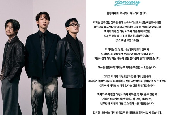 28일 소속사 재뉴어리는 "피의자의 부모님과 법률 대리인을 통해 피의자가 미성년자이고, 피의자의 심신이 일반적으로 생각할 수 있는 것보다 심각하게 미약한 상태에 있다는 것을 확인하였다"며 "저희는 법무법인 정독을 통해 소속 아티스트 나상현씨밴드에 대한 허위사실 유포자(이하 피의자)에 대한 고소를 진행하고 있었으며 피의자의 진심 어린 사과와 이를 통해 작성한 사과문 수령 후 2025년 11월 26일 고소 취하서를 제출했다"고 밝혔다.