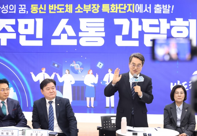 김 지사는 28일 19번째 '민생경제 현장투어'를 위해 안성 동신일반산업단지를 찾았다. 현재 도가 조성 중인 '세계 최대 반도체 메가 클러스터'의 핵심 축 가운데 하나다. 인근 안성시 금광면사무소에서 동신일반산업단지 관련 주민 소통 간담회를 열고, 소재·부품·장비 특화단지 및 산업단지 조성에 따른 현안과 주민 요구사항을 경청했다.