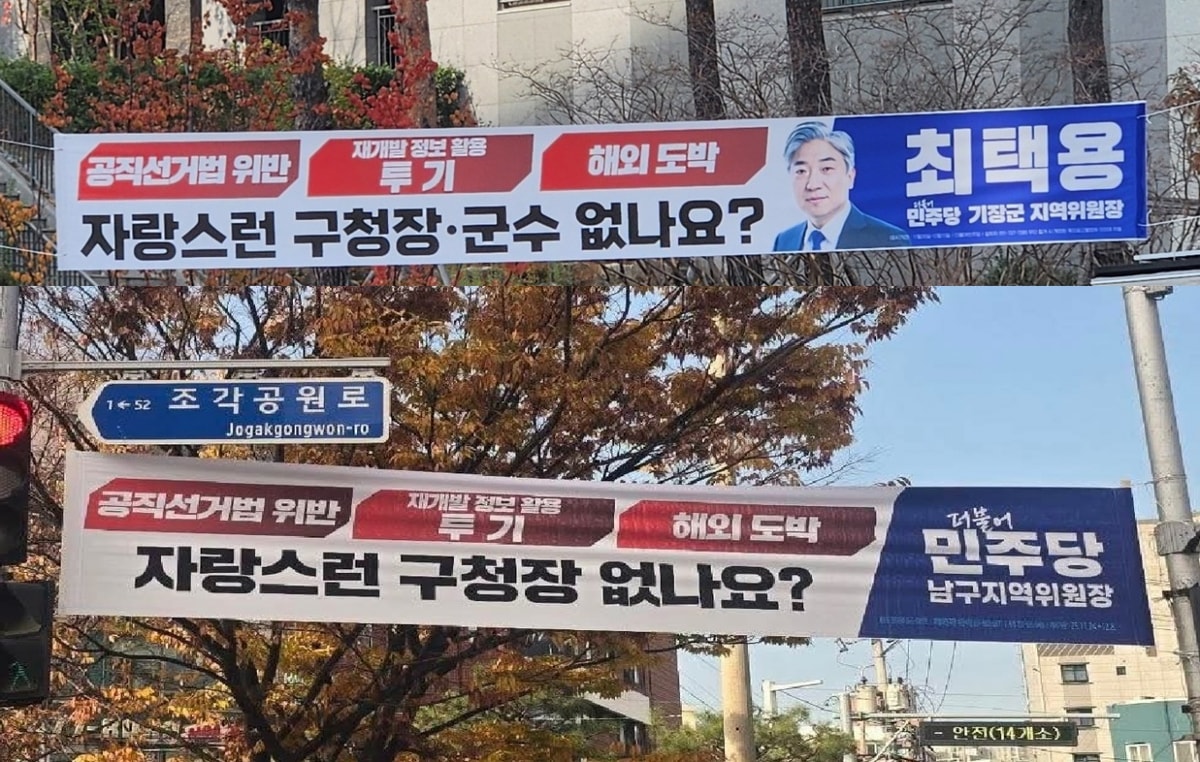 최근 부산 남구 조각공원로 일대와 기장군 주요 도로변에는 '공직선거법 위반', '재개발 정보 활용 투기', '해외 도박'이라는 붉은색 자극적 문구와 함께 "자랑스런 구청장(군수) 없나요?"라는 문장이 적힌 현수막이 동시다발적으로 게시됐다. 현수막에 표시된 공직선거법 위반은 동구청장, 재개발 정보 활용투기는 사상구청장, 해외 도박은 금정구청장을 지칭한 것이며 기장군과 남구 등의 단체장은 해당 사항이 없는 내용이다.
