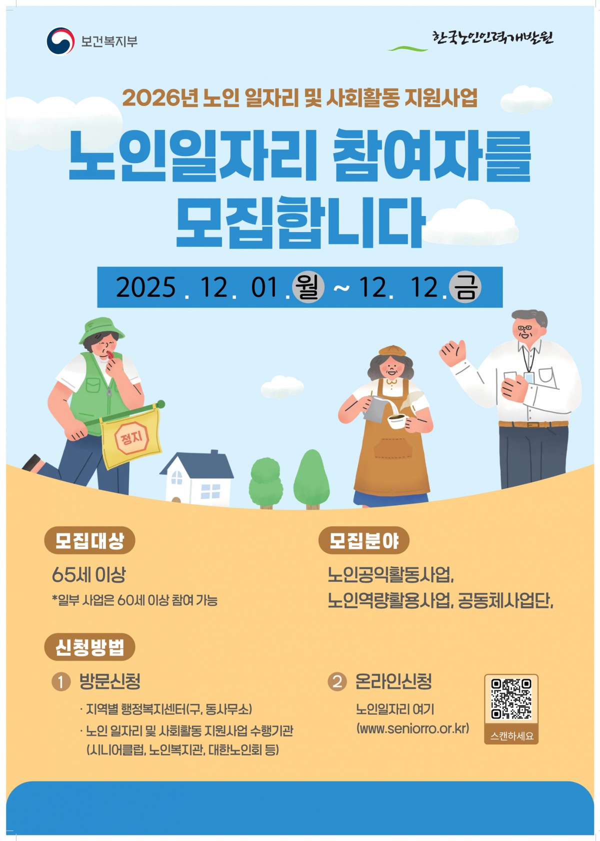 2026년 노인일자리 사업에는 올해보다 14% 증가한 208억원이 투입되며 참여자 규모도 460여 명 늘어난 4477명을 모집할 계획이다. 시는 고령층의 소득 보전과 사회참여 확대를 위해 사업 물량을 확대했다고 밝혔다.