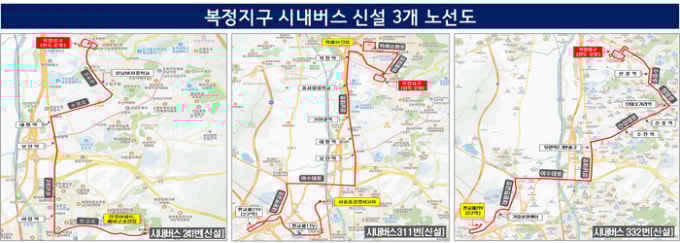 복정지구는 위례신도시와 가깝고 헌릉로를 통해 공원로·성남대로·수정로 등 주요 간선도로와 연결되는 지역으로, 시는 세 개 간선축에 각각 한 개씩 총 세 개 노선(241번·311번·332번)을 신설해 신규 개발지역과 시내 주요 거점 및 본시가지를 직접 연결한다.
