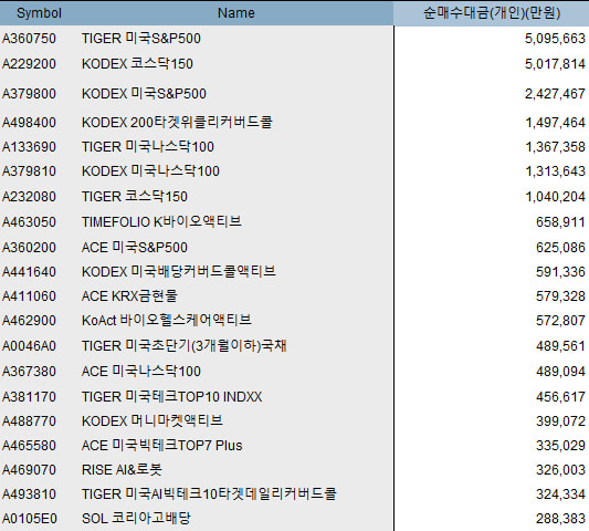 2일 한국거래소에 따르면 1일 종가 기준 개인 순매수 1위는 'TIGER 미국S&P500'로 509억5663만원을 기록했다. 2위는 'KODEX 코스닥150'(501억7814만원), 3위는 'KODEX 미국S&P500'(242억7467만원)가 차지했다.