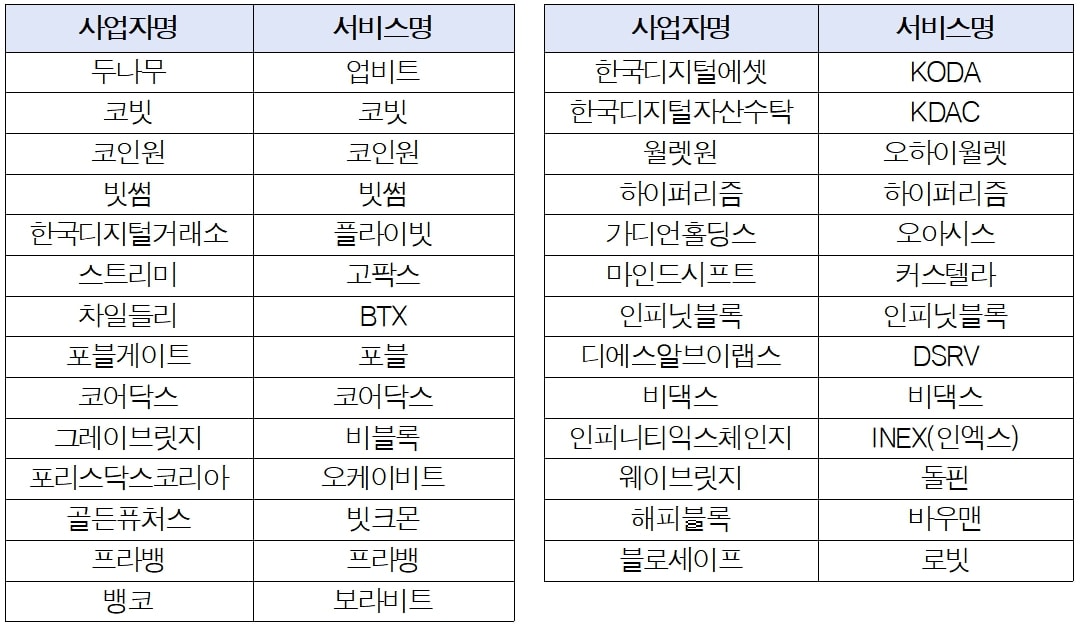 현재 FIU에 적법하게 신고된 가상자산사업자는 27개 업체(표 참조)이며 이외에 내국인 대상으로 영업을 하는 가상자산 취급업자는 모두 불법이라는 게 금융위 설명이다.