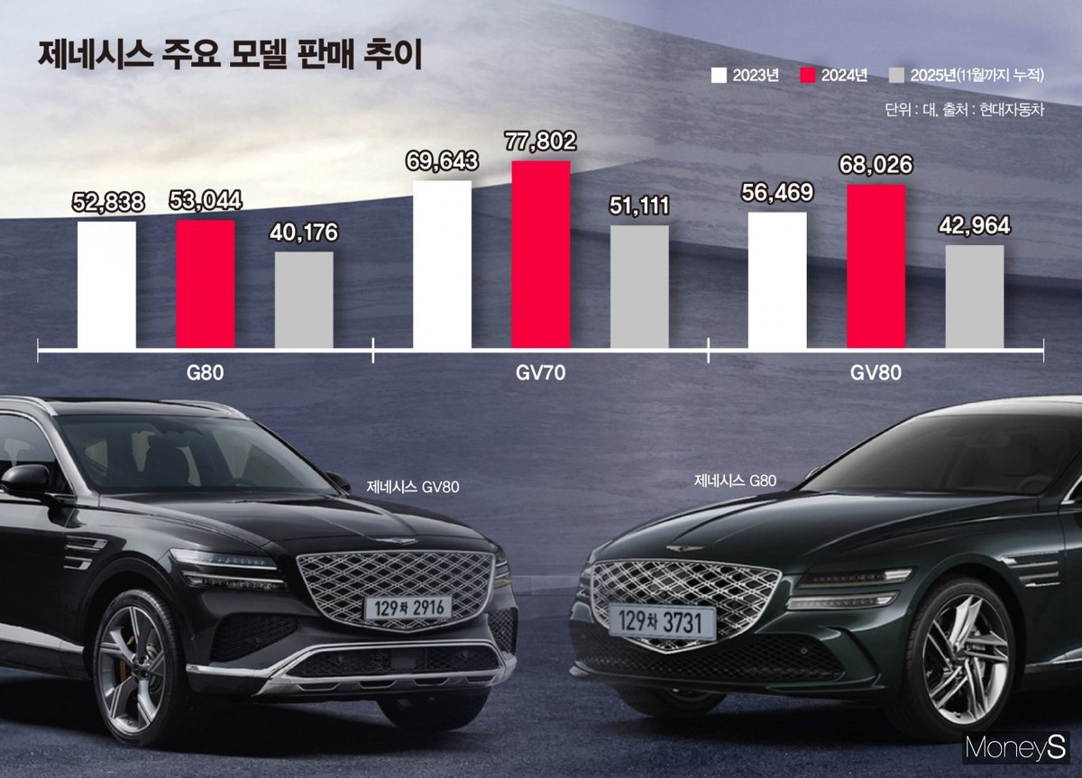 판매량 둔화 흐름은 데이터에서도 확인된다. 현대차에 따르면 올해 1~11월 기준 ▲G80 4만176대 ▲GV70 5만1111대 ▲GV80 4만2964대를 기록했다. 전년과 비교하면 약 20% 줄어든 수준이다. 지난해만 해도 GV70과 GV80 모두 6만대를 넘겼지만 올해는 전 차종에서 감소세가 나타났다.