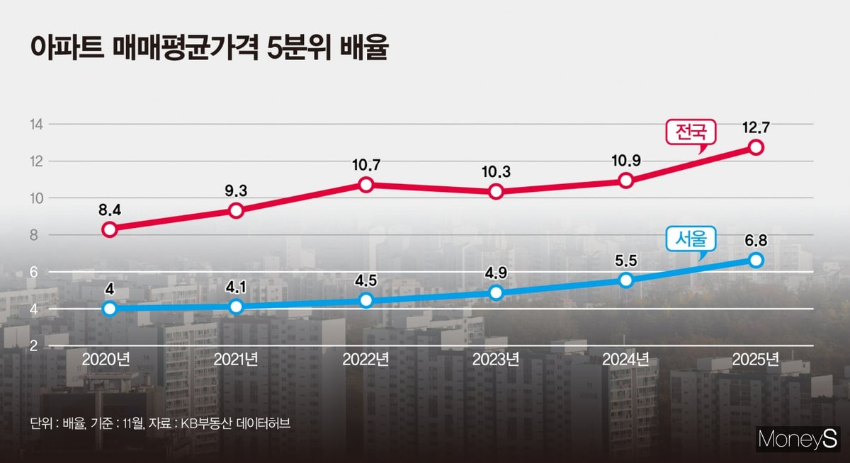 2일 KB부동산 데이터허브에 따르면 지난달 전국 아파트 평균 매매가격 5분위 배율은 12.7배로 관련 통계 작성 이래 최대치를 경신했다. 5분위 배율은 주택을 가격 순으로 5등분해 상위 20%(5분위)의 평균 가격을 하위 20%(1분위)의 평균 가격으로 나눈 값이다. 해당 수치가 클수록 고가와 저가 주택의 가격 차이가 크다는 의미다. 저가 주택 12.7채 가격이 고가 주택 1채를 살 수 있는 금액이다.