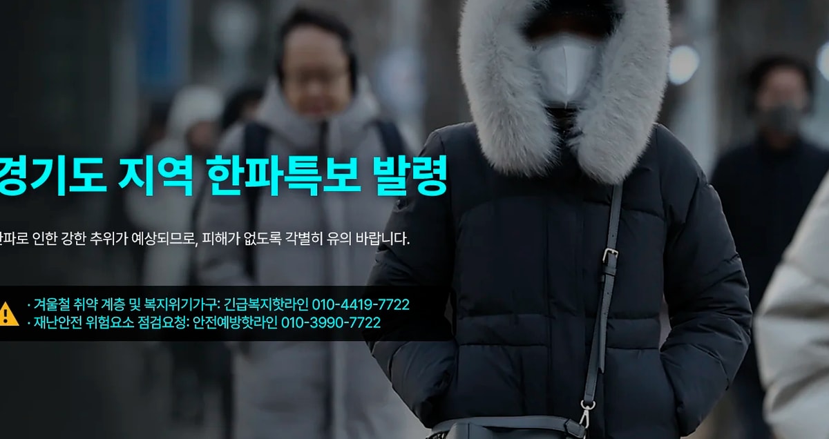 기상청은 2일 밤 9시를 기해 안산·동두천·연천·포천·가평 등 경기도 19개 시군에 한파특보를 발령했다. 오는 3일과 4일 도내 아침 최저기온이 영하 12℃에서 영하 7℃ 수준으로 큰 폭으로 떨어져 올겨울 들어 가장 강한 추위가 예상된다. 이에 경기도는 이날 오전 11시부터 합동전담팀을 운영하기 시작했다.