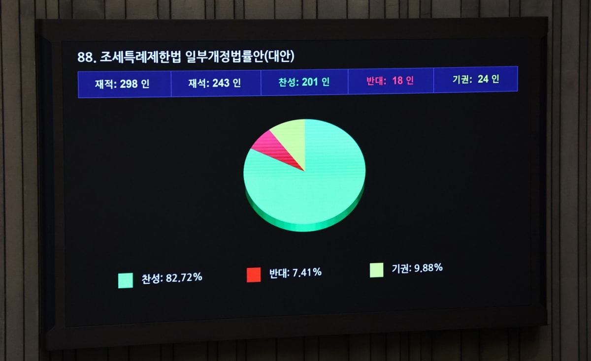 다만 여야는 내년부터 고배당 상장기업 투자로 얻는 배당소득에 대해 분리과세를 적용하는 조세특례제한법 개정안은 재석 243명 중 찬성 201명, 반대 18명, 기권 24명으로 합의 처리했다.