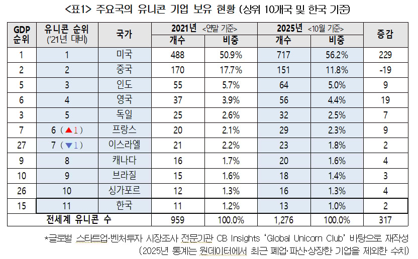 코로나19 이후 4년간 미국 유니콘 기업은 229개 증가해 전체 증가분의 72.2%를 차지한 반면 한국은 2개 증가에 그쳤다. 19개가 감소한 중국을 제외하면 가장 저조한 유니콘 배출 양상을 보인 것이다.