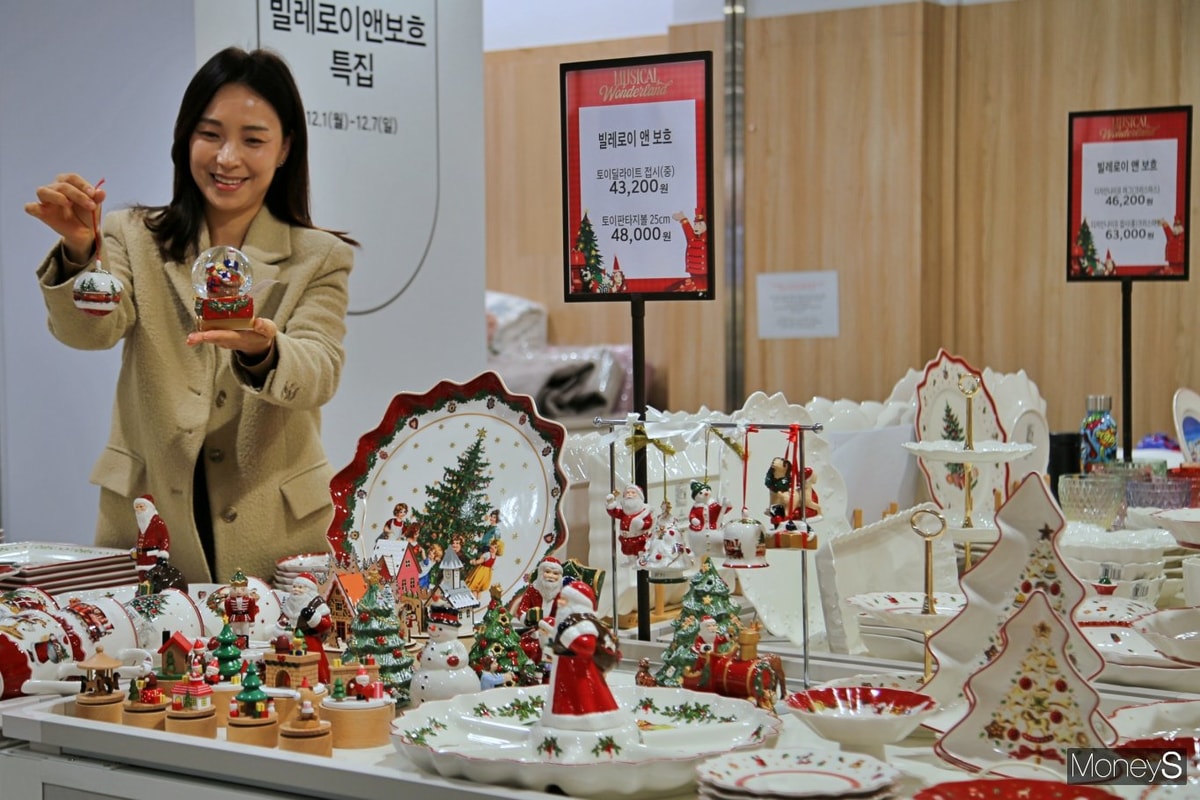 광주신세계 본관 지하 1층 이벤트홀 매장 직원이 '빌레로이앤보흐' 오너먼트와 스노우볼을 선보이고 있다/사진=광주신세계 제공.