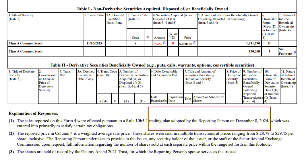 일각에서는 사고 발생 시점(11월6일 추정) 직후 재무 책임자가 주식을 처분했다는 점을 들어 미공개 정보를 이용한 손실 회피 의혹을 제기했다. 아난드 CFO가 제출한 '증권 소유권 변동 신고서'를 살펴본 결과 이번 매도는 '내부자 거래 사전 계획'(Rule 10b5-1)에 따라 1년 전에 예고한 것으로 확인됐다.